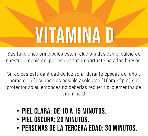 Debido a las preocupaciones de cáncer de piel, algunos dermatólogos y dermatólogas recomiendan obtener toda la vitamina D de los suplementos en lugar de el sol. Las cantidades de sol mencionadas para pieles claras y oscuras, deben ser seguras, pero no se ha visto algún estudio sobre cuánta cantidad de sol es segura para las personas de edad avanzada, se recomienda hablar con su médico acerca de cómo obtener vitamina D si crees que está en riesgo de padecer cáncer de piel.